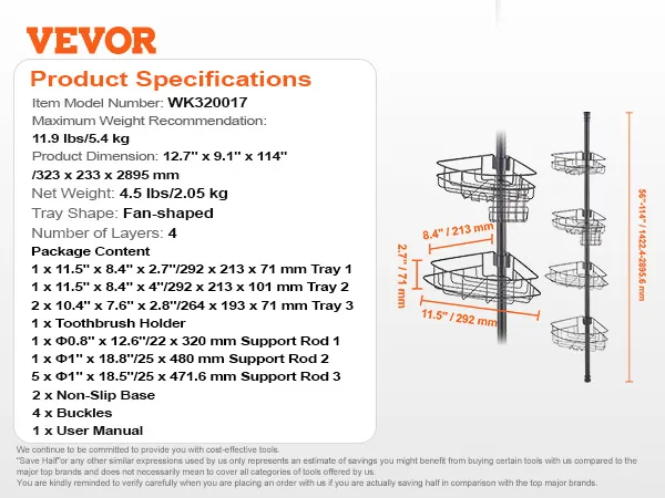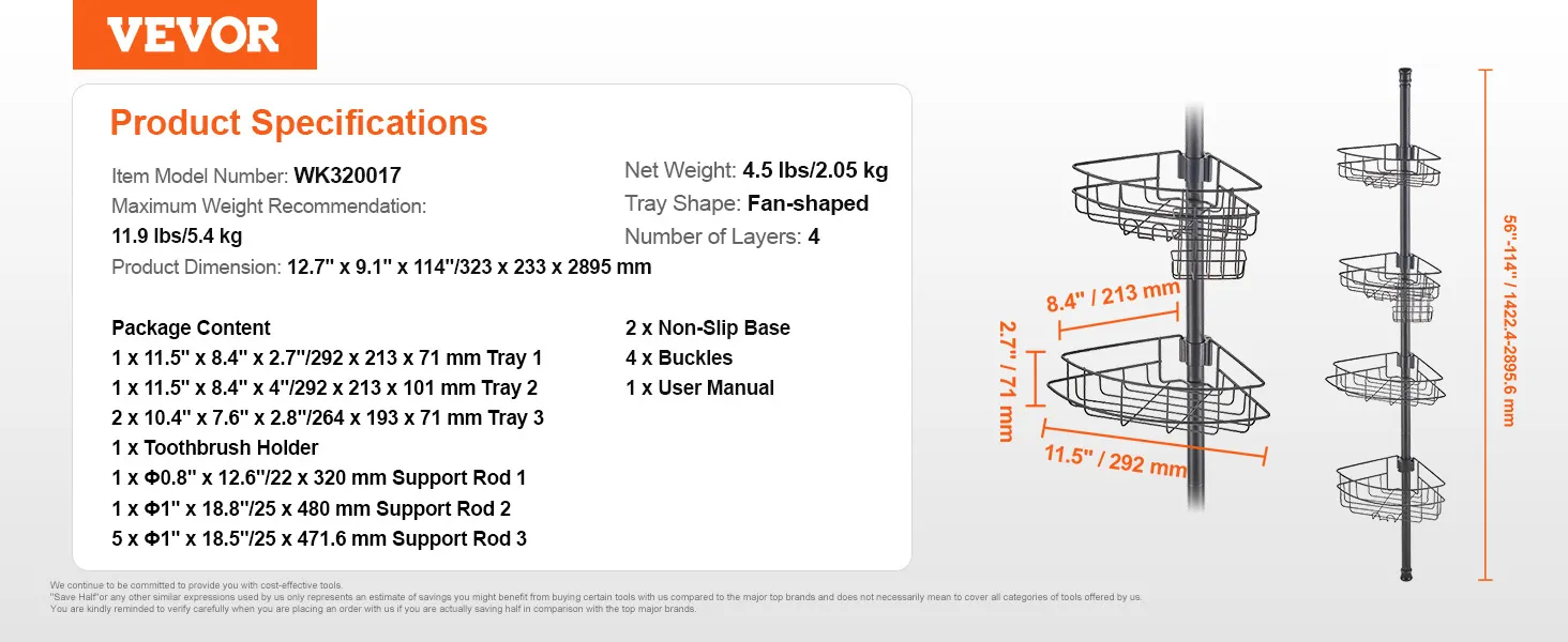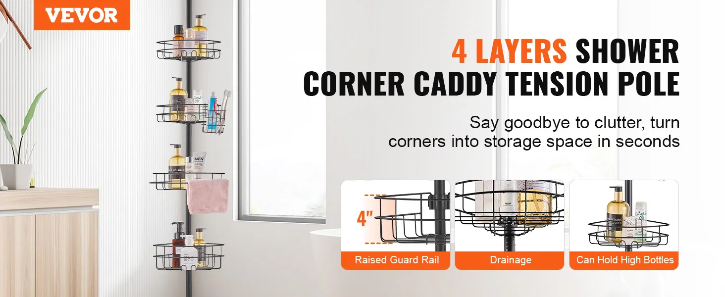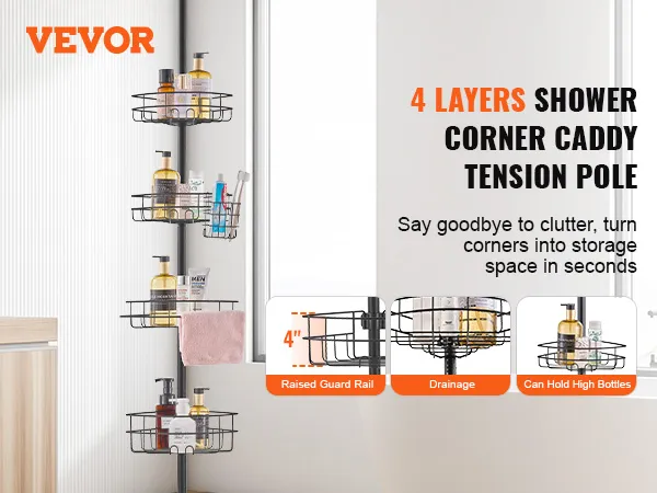 Adjustable Height: The shower corner caddy tension pole is designed for bathrooms with different heights. It supports 56" to 114" range adjustment, easily adapts to a variety of installation environments, making storage more convenient. To ensure safety and stability, please do not install on the ceiling or slanted ceiling. Note: The installation video is for reference; the actual product color matches the page description and images.
