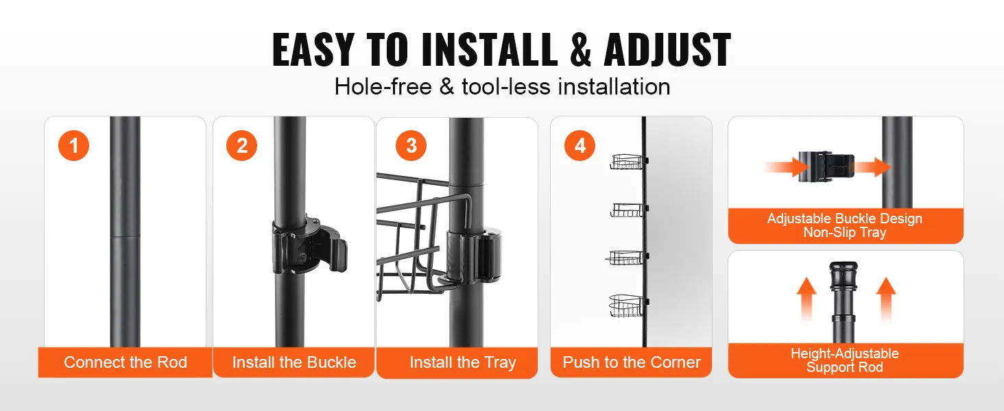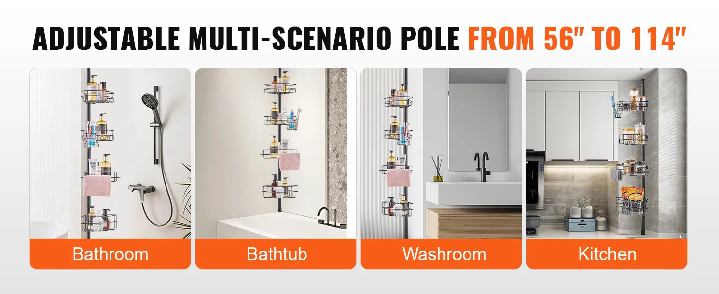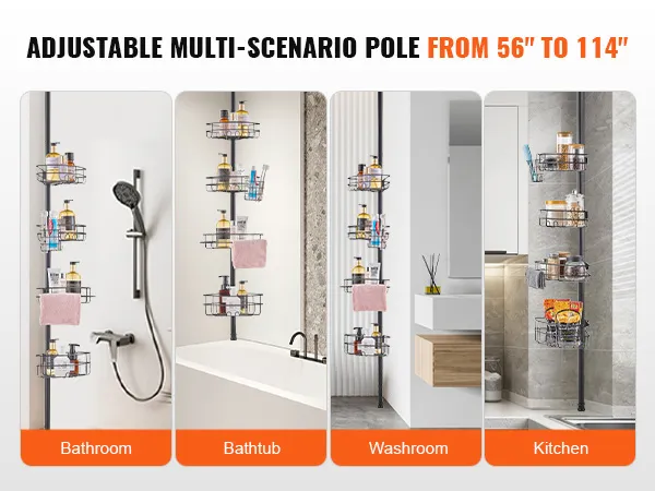 The 56" to 114" adjustable tension pole can adjust according to the actual height of your bathroom, whether it's a high-rise apartment or a low-rise home. Meanwhile, the separate shower organizer can be placed not only in the bathroom, but also in the bathtub, RV etc.