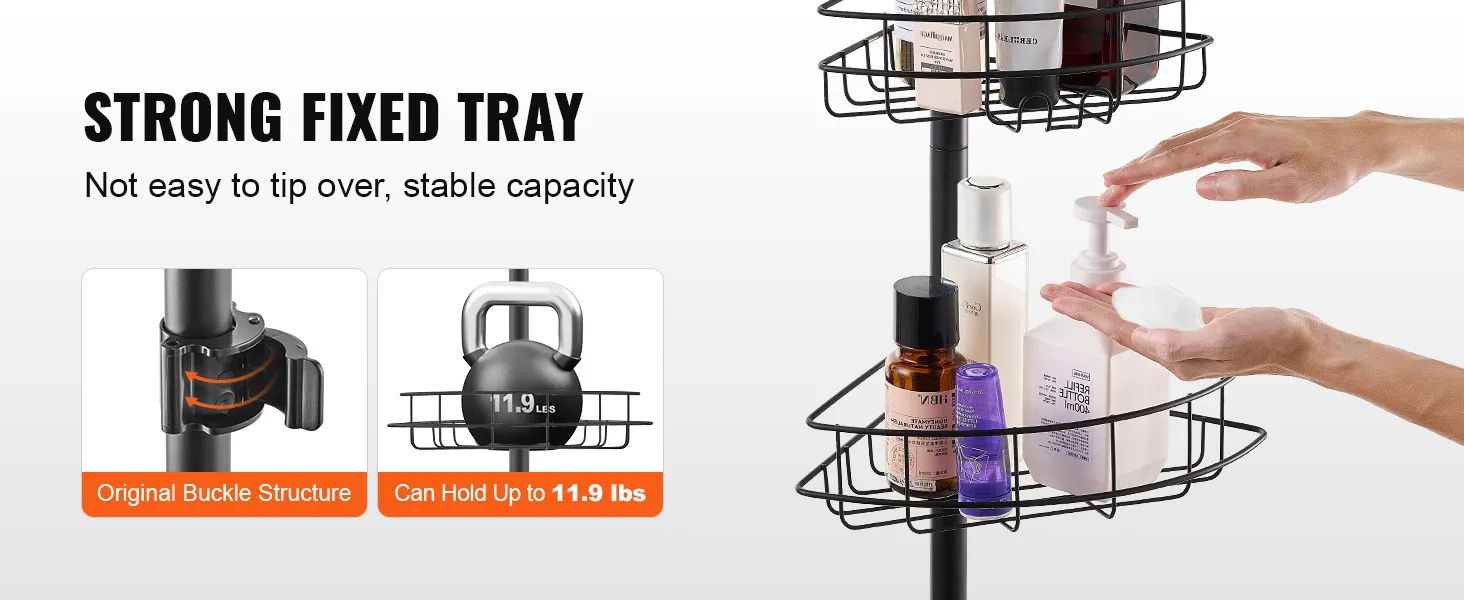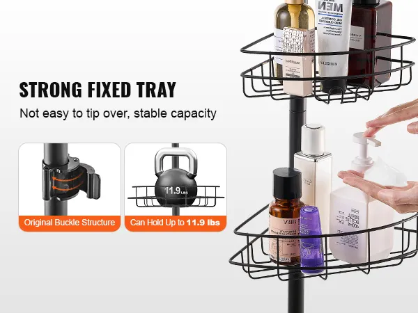 Innovative Buckle Design: The shower corner caddy tension pole is equipped with innovative buckle locking device, which simplifies and stabilizes the installation process, effectively avoiding the tray from slipping. Its strong load-bearing tray can easily support up to 11.9lbs of heavy loads, providing a secure place for you to use.