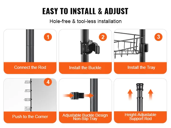 The tension pole features an innovative buckle design that ensures the tray stays firmly in place. The support bar design allows users to easily adjust the height to fit different space requirements, enhancing the flexibility of use. The installation process is quick and easy for family.