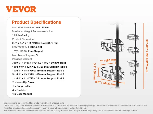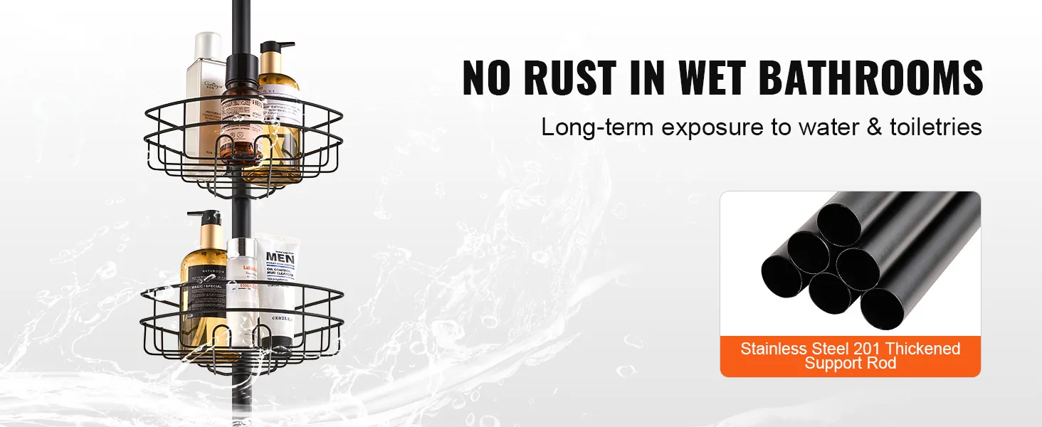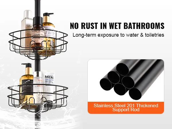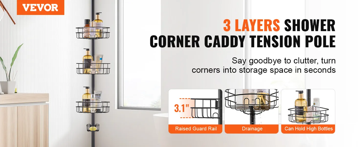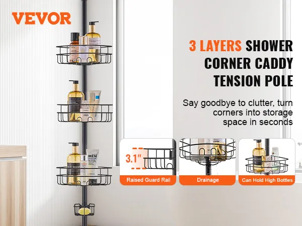 VEVOR Spanstang voor hoekdoucheplank 991-3175 mm hoog, multifunctionele spanstang voor de douche met sterke en dragende plank Spanstang voor badkamerwasruimtes Zwart 3 lagen