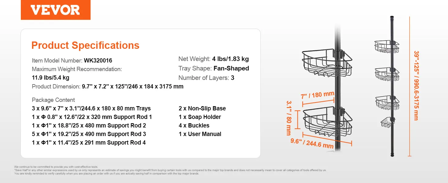 De trekstang van het douchehoekplanchet is verstelbaar van 991 tot 3175 mm. De montage vindt plaats zonder boren. Installatie op plafonds of schuine daken moet worden vermeden. De plank is gemaakt van roestvrij staal en is voorzien van een vergrendelingsmechanisme.