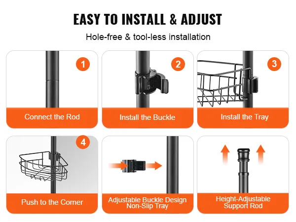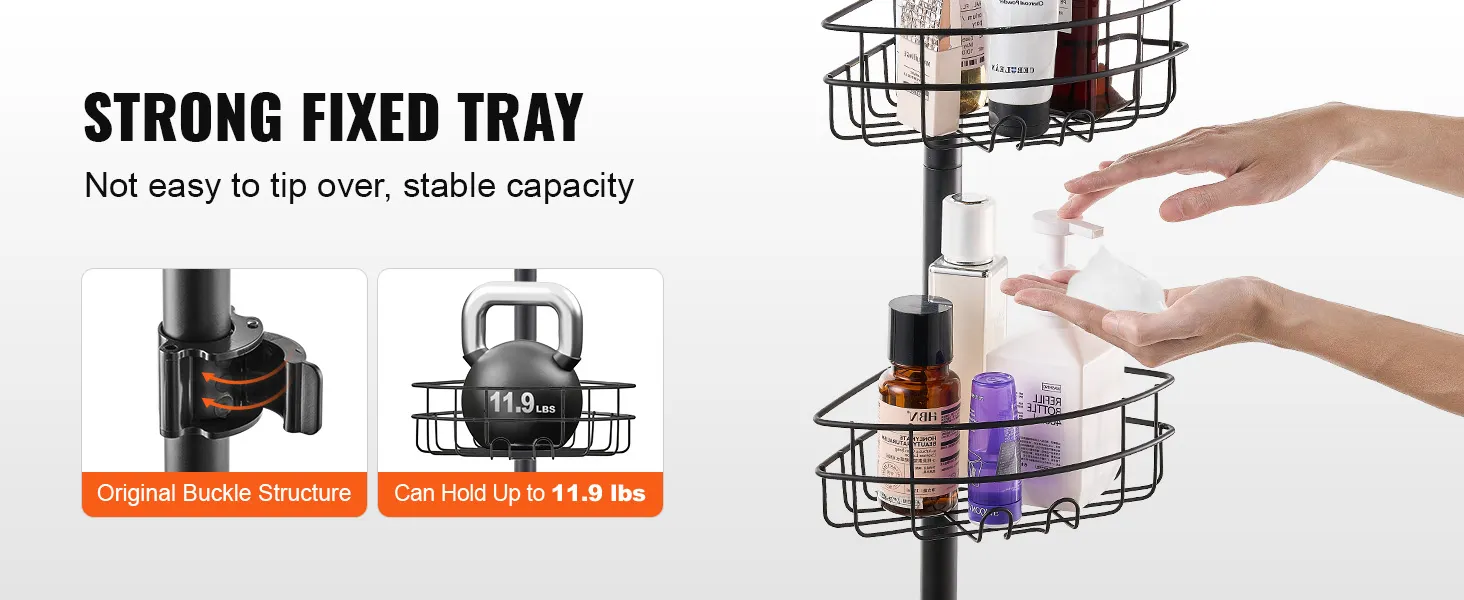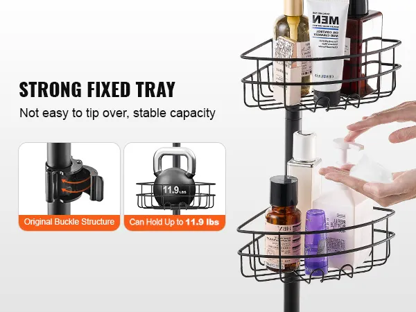 Innovatief gespontwerp: de trekstang van het douchehoekplank is uitgerust met een innovatief gespslot, dat het installatieproces vereenvoudigt en stabiliseert en effectief voorkomt dat de bak wegglijdt. De stevige, robuuste lade kan gemakkelijk lasten tot 5,4 kg (11,9 lbs) dragen en biedt u een veilige plek om hem te gebruiken.