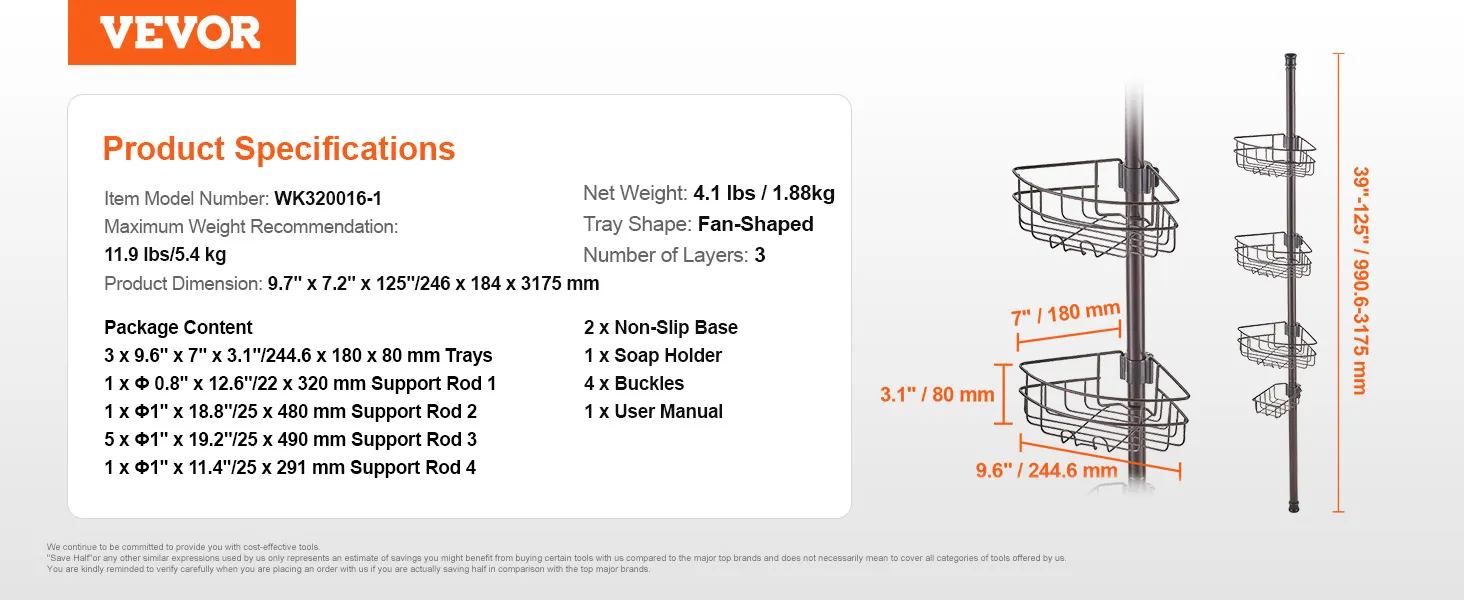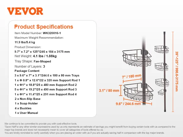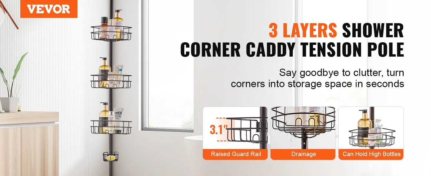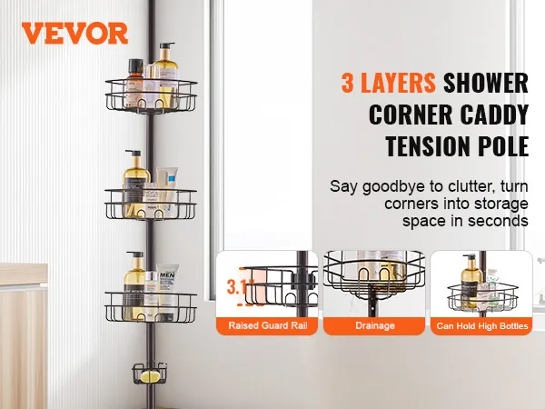 GROTE CAPACITEIT: De spanstang van de hoekdoucheplank is zorgvuldig ontworpen met 3 ruime grote planken en 1 zeephouder, die voldoende opbergruimte biedt voor uw badkamer. Tegelijkertijd voorkomt het ontwerp van de verhoogde reling effectief dat voorwerpen per ongeluk vallen, wat de veiligheid en het comfort tijdens het gebruik garandeert.