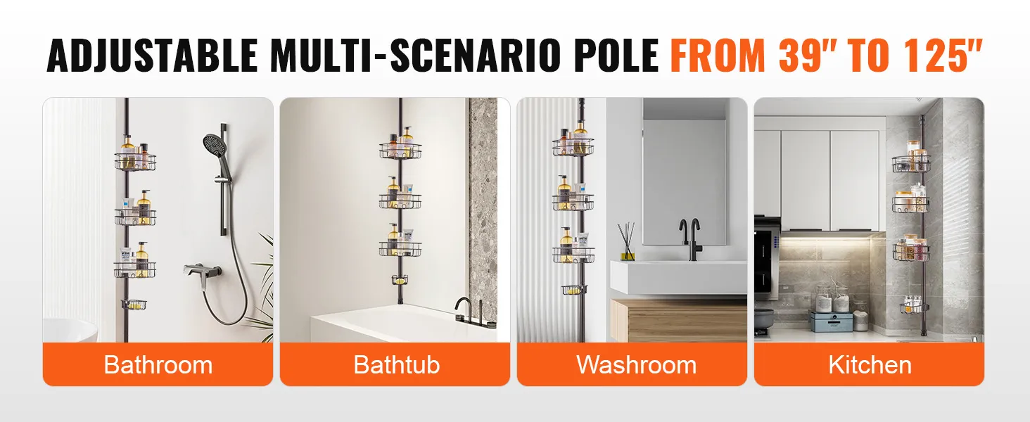 Verstelbare hoogte: de hoekdouche-spanstang is ontworpen voor badkamers met verschillende hoogtes. Het ondersteunt een bereikaanpassing van 39 tot 125 inch (991-3175 mm), past zich gemakkelijk aan een verscheidenheid aan installatieomgevingen aan en maakt opslag handiger. Om de veiligheid en stabiliteit te garanderen, mag u het apparaat niet aan het plafond of schuine plafonds installeren.