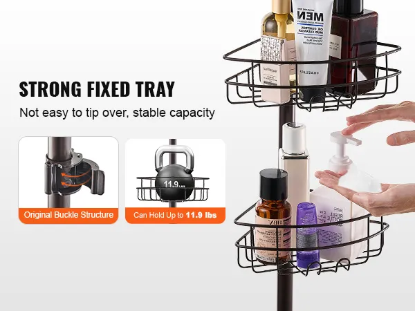 Innovatief gespontwerp: de trekstang van het douchehoekplank is uitgerust met een innovatief gespslot, dat het installatieproces vereenvoudigt en stabiliseert en effectief voorkomt dat de bak wegglijdt. De stevige, robuuste lade kan gemakkelijk lasten tot 5,4 kg (11,9 inch) dragen en biedt u een veilige plek om hem te gebruiken.