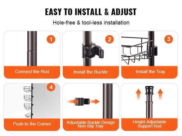 Stabiel en antislip: de spanstang van de douchehoekplank heeft een versterkt veerontwerp, wat de stabiliteit van de installatie aanzienlijk verbetert en goede prestaties tijdens gebruik garandeert. De zorgvuldig geconfigureerde antislipvoetjes kunnen ook in de badkamer stevig worden bevestigd. Zo kan hij stabiel bevestigd worden.