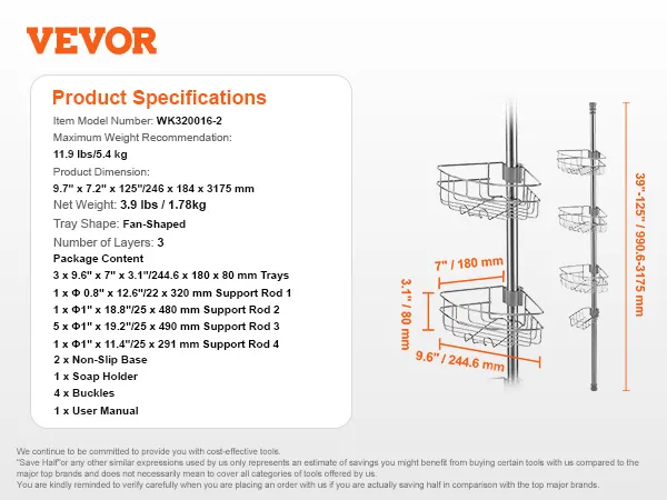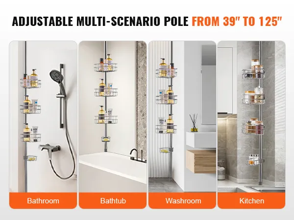 Verstelbare hoogte: de hoekdouche-spanstang is ontworpen voor badkamers met verschillende hoogtes. Het ondersteunt een bereikaanpassing van 39 tot 125 inch (990-3175 mm), past zich gemakkelijk aan een verscheidenheid aan installatieomgevingen aan en maakt opslag handiger. Om de veiligheid en stabiliteit te garanderen, mag u het apparaat niet aan het plafond of schuine plafonds installeren.