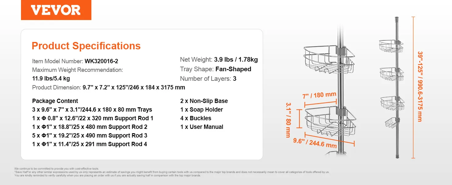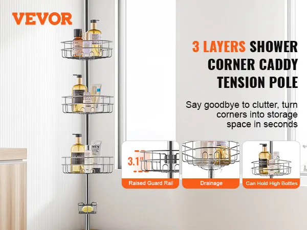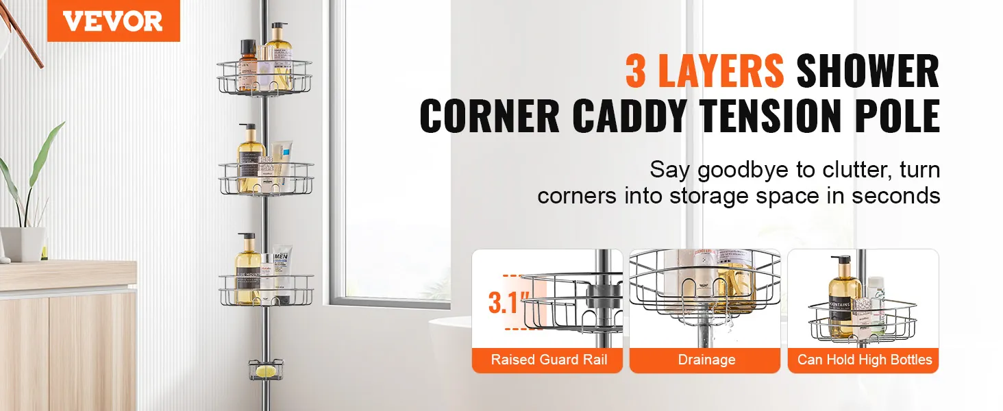 VEVOR Hoekdoucheplank, Douchecaddy, Hoekdoucheplank, 990-3175 mm hoge spanstang, Multifunctionele opbergruimte voor de douche met sterke, dragende plank, Geschikt voor badkamers en wasruimtes