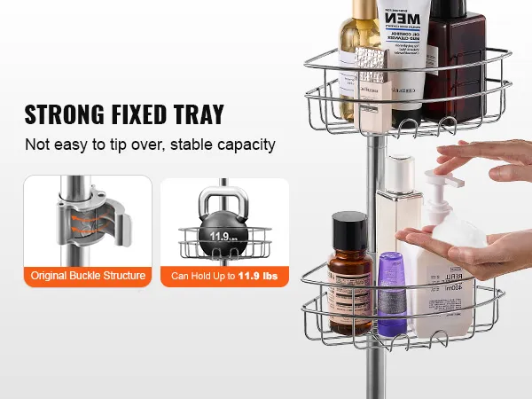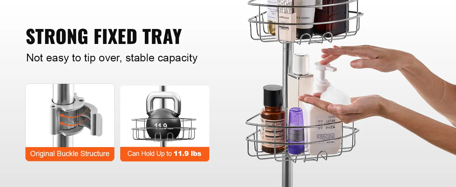 Innovatief gespontwerp: de trekstang van het douchehoekplank is uitgerust met een innovatief gespslot, dat het installatieproces vereenvoudigt en stabiliseert en effectief voorkomt dat de bak wegglijdt. De stevige, robuuste lade kan gemakkelijk lasten tot 5,4 kg (11,9 lbs) dragen en biedt u een veilige plek om hem te gebruiken.