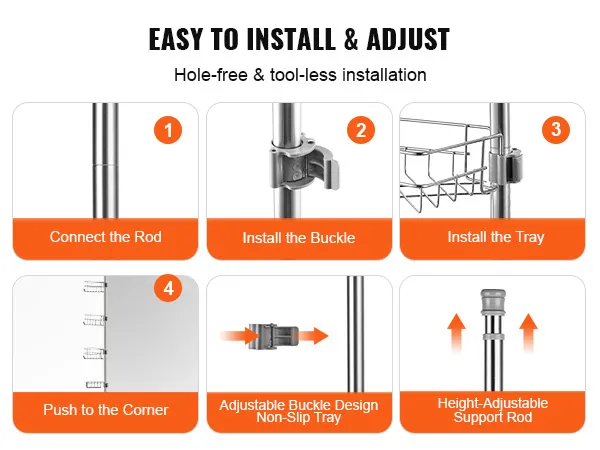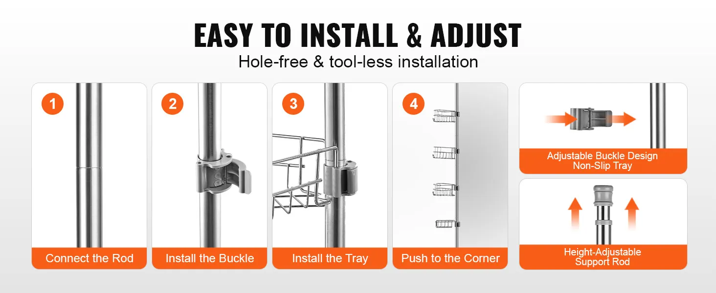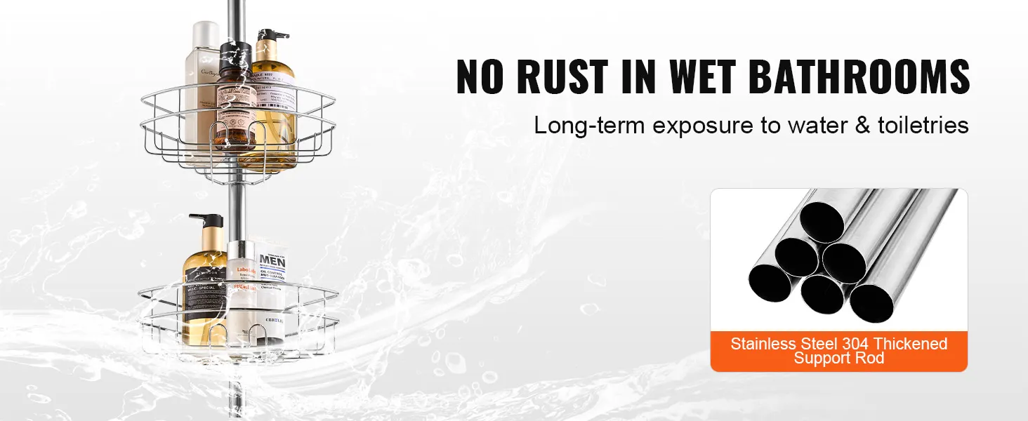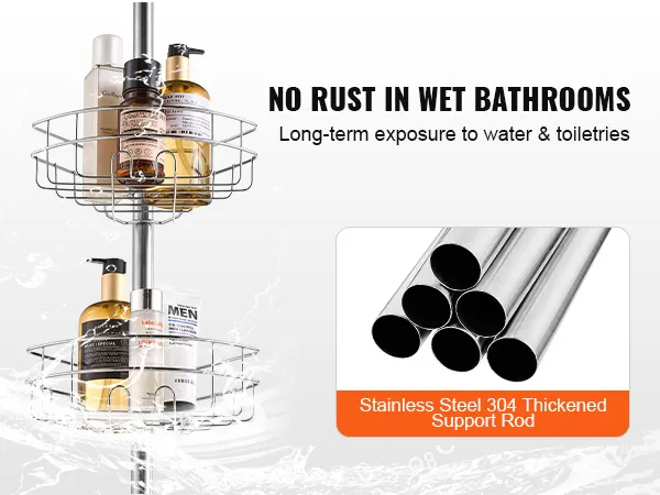 De badkamerorganizer met trekstang voor de hoekdouche is gemaakt van hoogwaardig roestvrij staal, dat corrosiebestendig en stevig is. Zelfs als hij lange tijd in water wordt ondergedompeld of veelvuldig in contact komt met toiletartikelen, is hij nog steeds zo goed als nieuw.