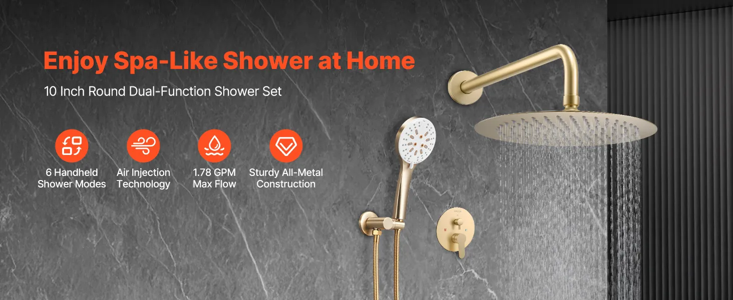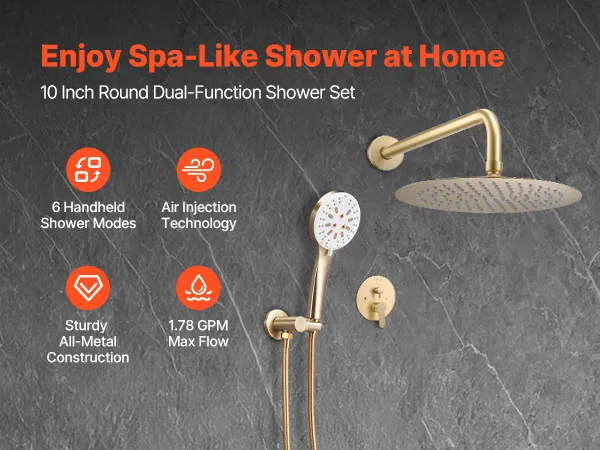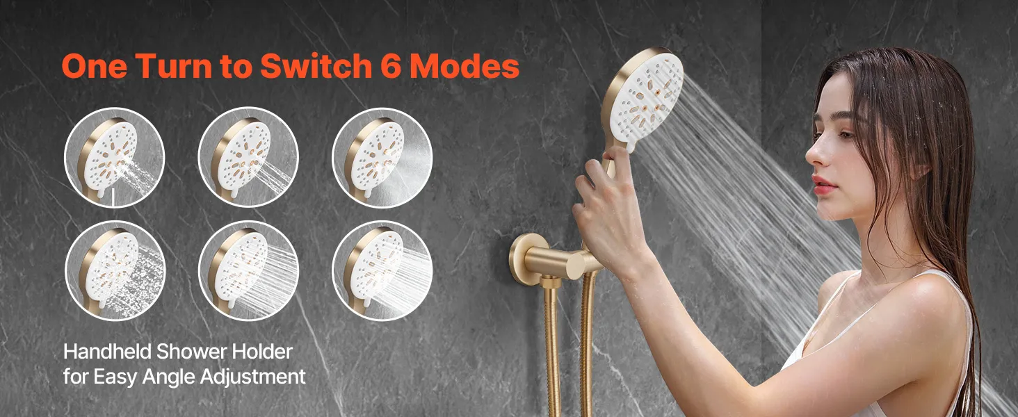 Hogedrukdouche: Ons douchesysteem met dubbele functie biedt een luxe ervaring dankzij luchtinjectietechnologie, die zelfs bij een lage waterstand voor hoge druk zorgt. Bespaar water met een debiet van 6,7 l/min en geniet van een ontspannende spa-achtige douche.