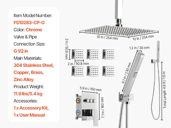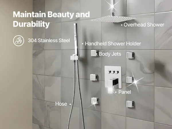 Eenvoudig onderhoud: onze doucheset is voorzien van een massief messing kraan en een keramische drukbalancerende cartridge voor lekvrije prestaties en een constante waterstroom. Een plaat van roestvrij staal 304 voegt stijl toe, terwijl siliconen sproeiers kalkaanslag verwijderen en een constante waterstroom garanderen.