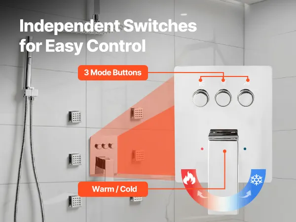 Douchesysteem met 3 functies: Onze douchekraanset bestaat uit zes lichaamsdouches, een hoofddouche en een handdouche met twee standen. Drie onafhankelijke knoppen en een draaiknop stellen u in staat de waterstroom en temperatuur te regelen. Het verborgen leidingontwerp zorgt voor een moderne stijl.