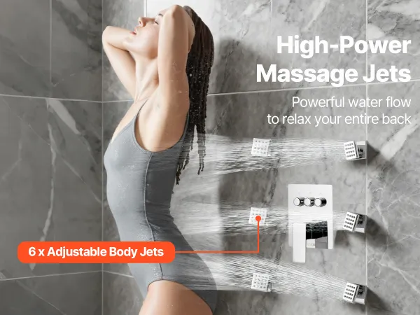 Ontspan je rug: het regendouchesysteem is uitgerust met kleine massagestralen die je naar behoefte kunt richten. Zes lichaamsjets zorgen voor een optimale dekking en sproeien warm, krachtig water op vermoeide, pijnlijke spieren, voor een verzachtende verlichting.