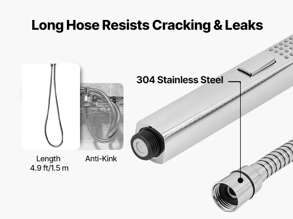 2-in-1 handdouche: Onderdeel van ons douchesysteem met douche- en sproeifuncties. De hogedrukstraal spoelt wanden en badkuipen schoon en schakelt vervolgens automatisch terug naar de douchestand om ongelukjes te voorkomen. Een slang van 1,5 meter en een draaibare houder maken reiniging vanuit meerdere hoeken mogelijk.