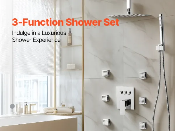 Onze doucheset verbergt de leidingen achter de muur, wat zorgt voor een strakke, luxe badkamerlook. De set bevat drie verfrissende douchefuncties – zes bodysprays, een handdouche en een hoofddouche – voor een optimale lichaamsbeleving.
