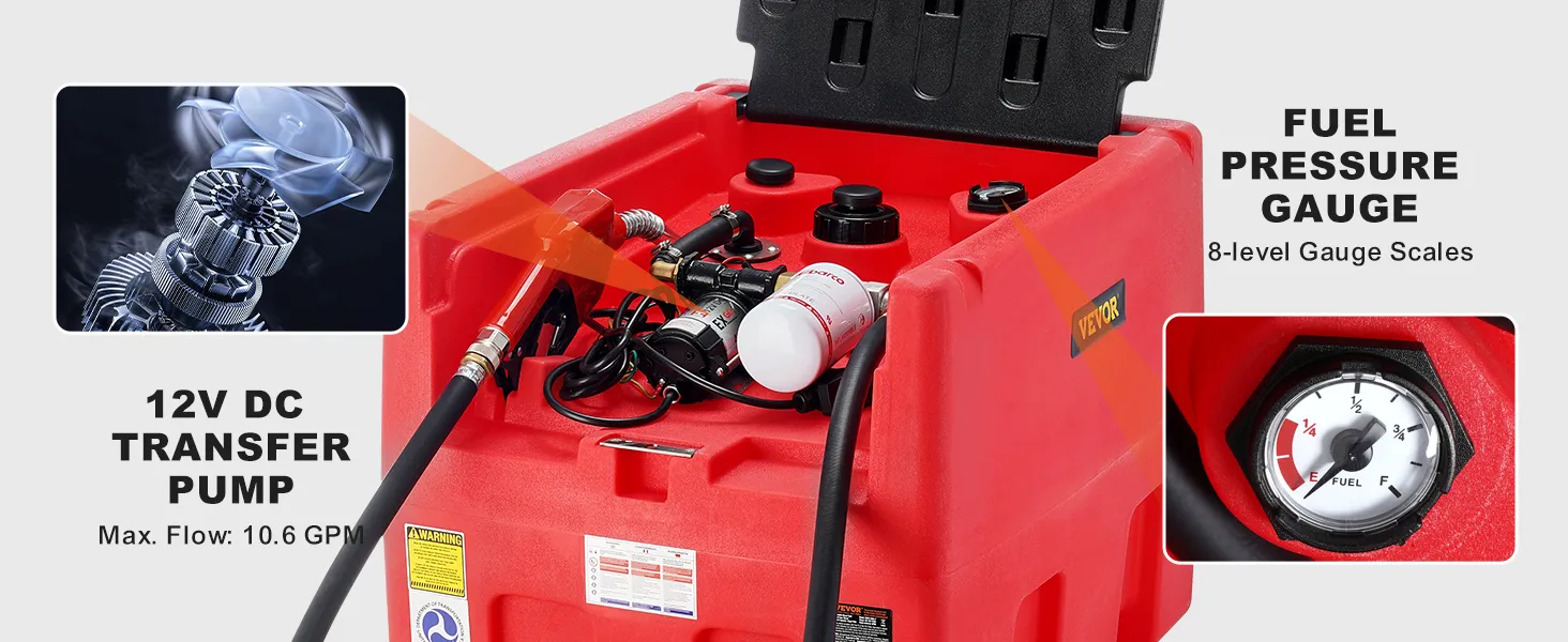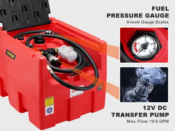 The diesel fuel tank's 12-volt transfer pump will deliver fuel at 10.6 gallons per minute, faster, and save you time and energy. The fuel gauge features 8-level gauge scales that help you monitor the capacity of fuel, allowing you to fill it up in time.