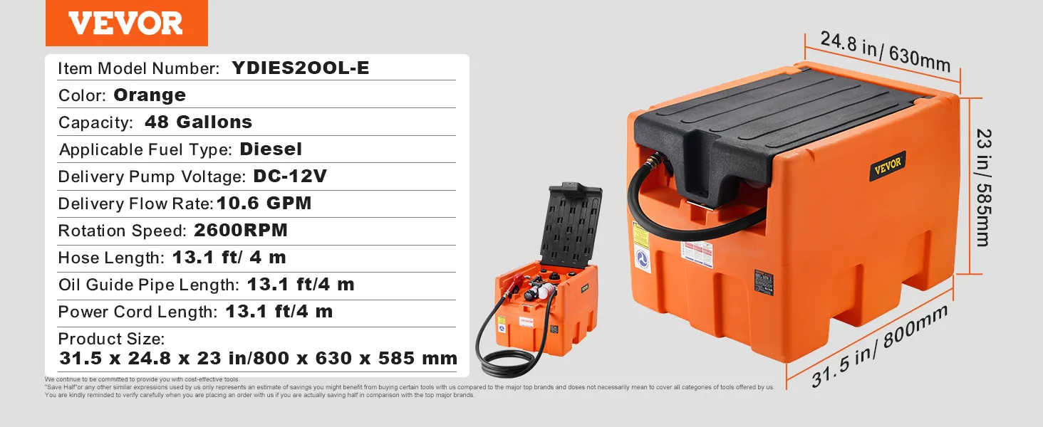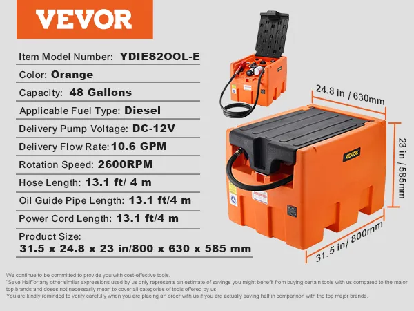 VEVOR Portable Diesel Tank, 48 Gallon, 10.6GPM Flow Rate, Diesel Fuel Tank with 12V Electric Transfer Pump, 13.1 ft Hose, Auto Fueling Nozzle, Diesel Transfer Tank for Easy Fuel Transportation, Orange