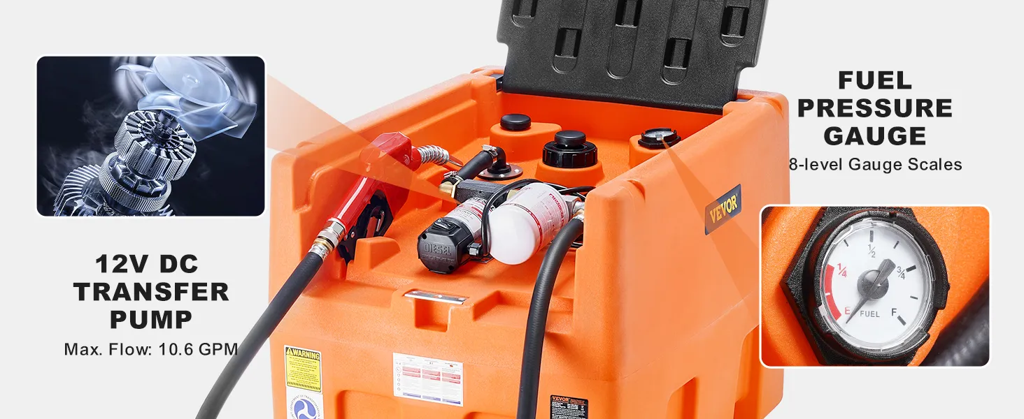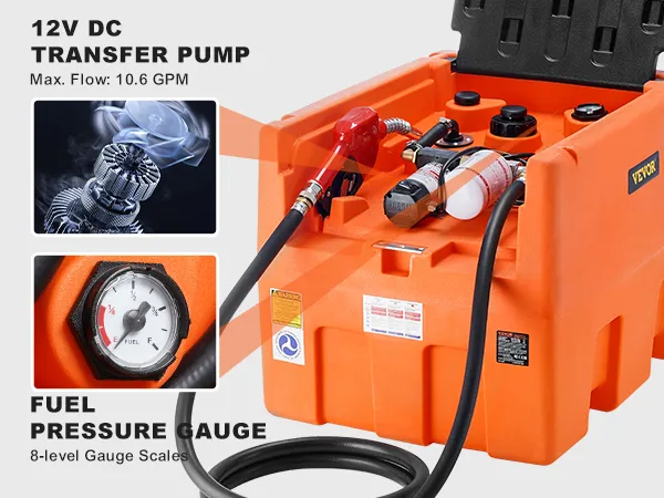 The diesel fuel tank's 12-volt transfer pump will deliver fuel at 10.6 gallons per minute, faster, and save you time and energy. The fuel gauge features 8-level gauge scales that help you monitor the capacity of fuel, allowing you to fill it up in time.