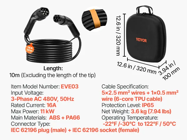 VEVOR EV-oplaadkabel, 16 A, 10 m, max. 11 kW, verlengsnoer, compatibel met type 2 elektrische voertuigladers, 3-fase AC 480 V 50 Hz, IP65, autolaadkabel met draagtas