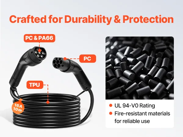 Ontworpen voor realistische omstandigheden: deze verlengkabel voor elektrische voertuigen is gemaakt van brandwerende materialen en is IP65 waterdicht. Hij werkt veilig van -30°C tot 50°C, regen of zonneschijn, zomer of winter.