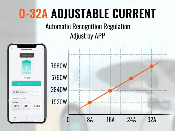 Intelligent Recognition Function: Our EV charging station type 2 can intelligently identify the user's home circuit. If the circuit can not withstand the charging power, it will automatically switch to the appropriate power charging. You won't have anything to worry about! Adjustment Unit: 1A, adjustment Range: 0-32A.