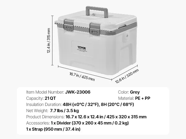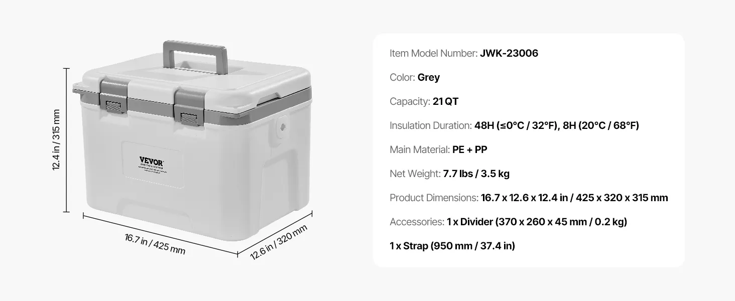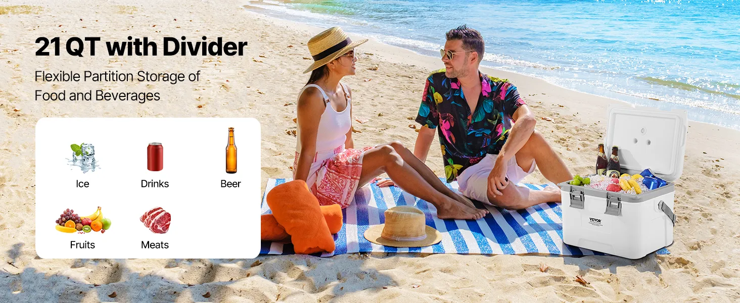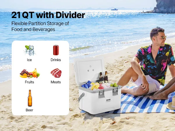 This cooler provides 21 quarts (about 20 liters) of storage space, providing ample room for a large amount of food and drinks.