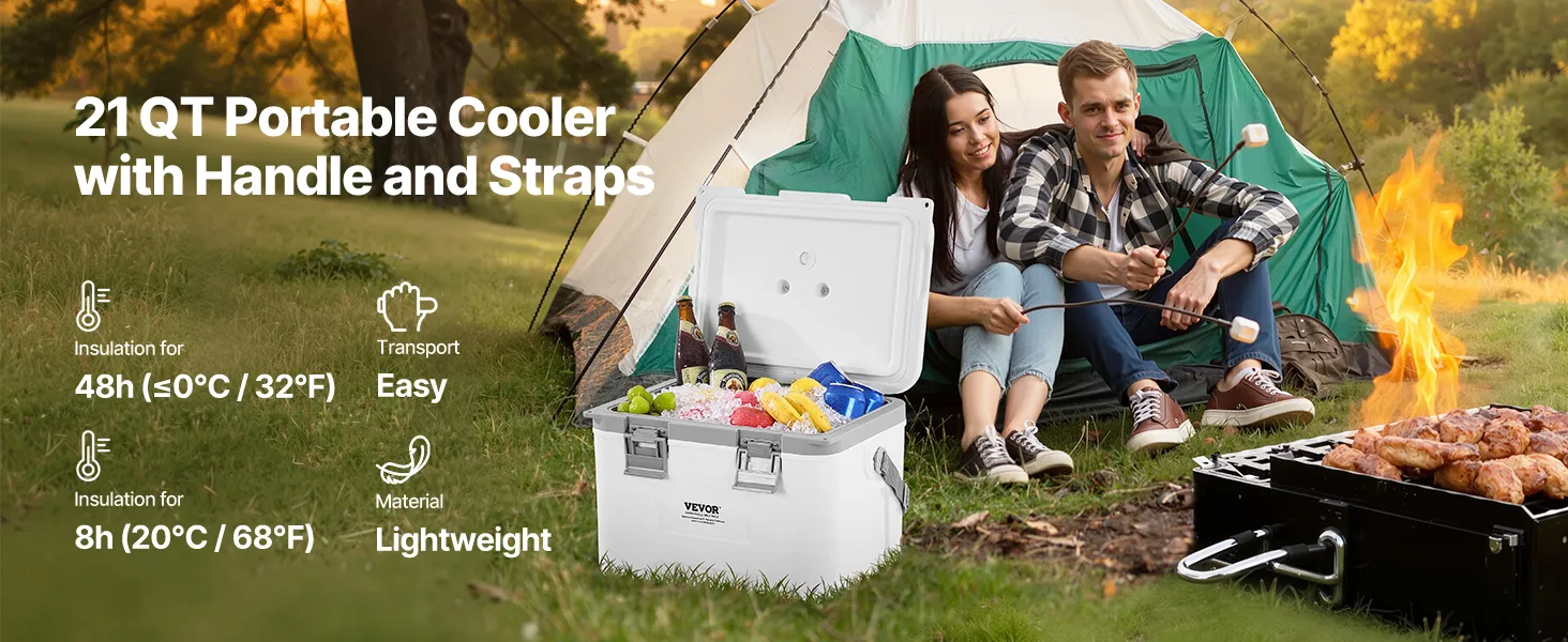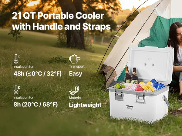 VEVOR Portable Cooler, 21 QT Hard Cooler with Ice Retention, Heavy-Duty Handles and Strap, Lightweight Rigid Material Insulated Portable Cooler, Suitable for Family Picnics and Short Trips