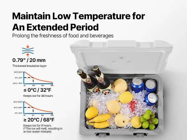 Long-Lasting Cooling: Featuring a 0.79" / 20 mm thick insulation layer, this cooler keeps ice for up to 48 hours in temperatures ≤ 0℃ / 32℉, and up to 8 hours in temperatures ≥ 20℃ / 68℉ (ice will melt, turning to ice water). Tip: For optimal results, avoid direct sunlight and use at least 40% ice relative to total volume.