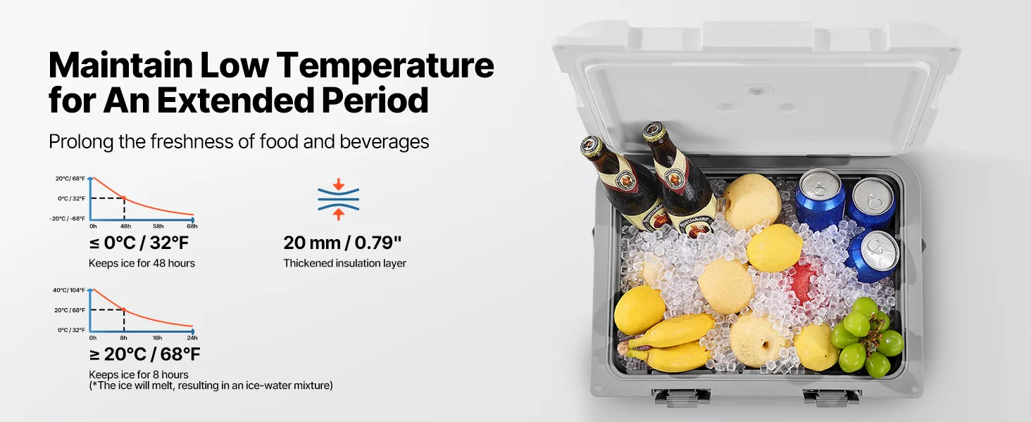 The cooler box is made with high-quality insulation materials, ensuring stable internal temperatures. It maintains low temperatures for extended periods, keeping food and drinks fresh longer.