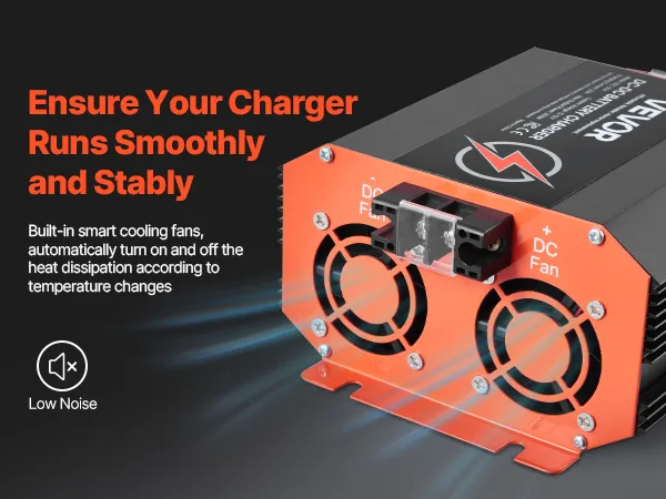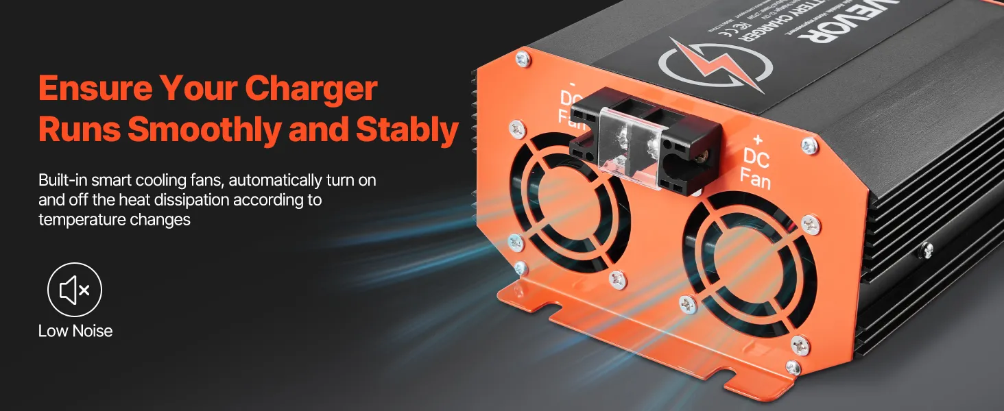 The built-in cooling fan automatically adjusts to the battery charger’s temperature, ensuring it runs smoothly and efficiently in any environment without overheating, so you can count on consistent performance every time.iable Performance