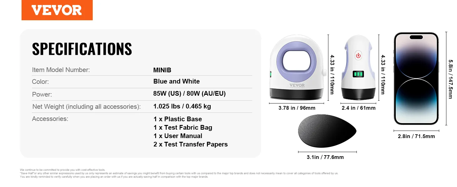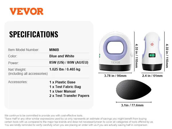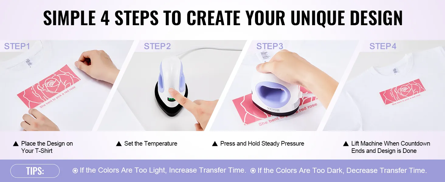 Drie warmte-instellingen: Laag: 145°C (285°F), Medium: 160°C (320°F), Hoog: 185°C (365°F). Of u nu zachte hitte nodig heeft voor delicate materialen of hogere temperaturen voor hardere oppervlakken, onze draagbare hittepers maakt het gemakkelijk om de perfecte instelling te vinden.