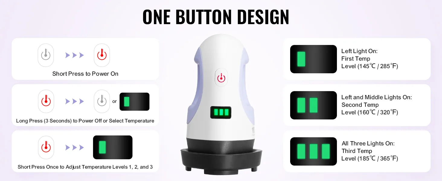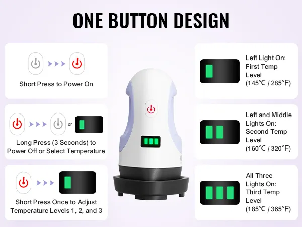 Bediening met één knop: kort indrukken om in te schakelen. Na het inschakelen nogmaals kort indrukken om de temperatuurstand te selecteren. Er zijn drie instellingen waaruit u kunt kiezen. Met slechts één knop stel je de temperatuur in, verander je de meeteenheid en zet je het apparaat eenvoudig aan en uit.