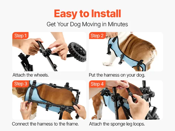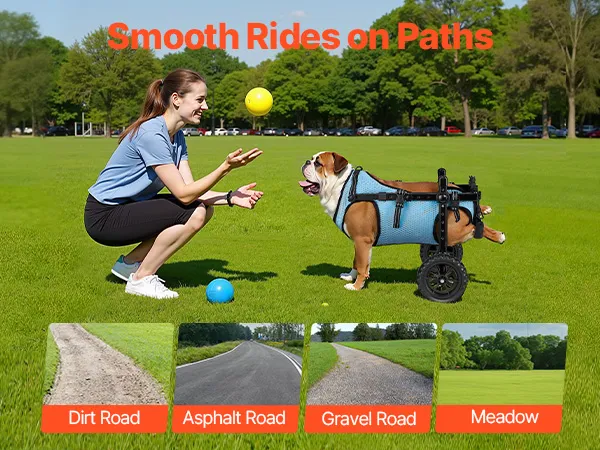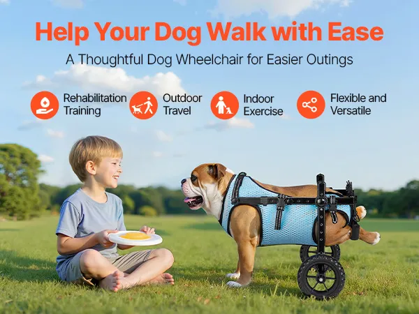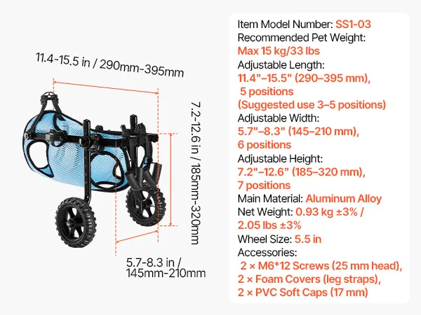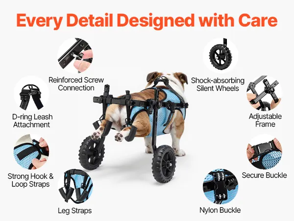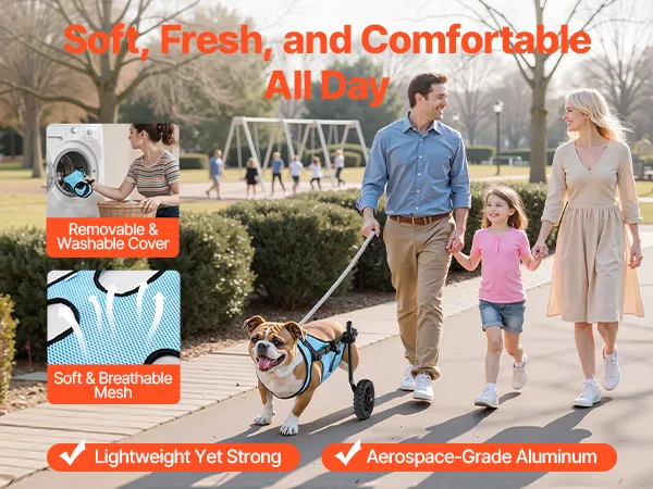 Doordachte comfort- en veiligheidsfuncties: de rolstoel voor huisdieren is voorzien van ademend, afneembaar gaas om uw hond koel en schoon te houden. Schokabsorberende, stille wielen met EVA-banden verminderen de impact, terwijl versterkte schroeven, D-ringen en sterke klittenbandsluitingen zorgen voor stabiliteit en veiligheid.