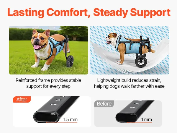 Lichtgewicht maar stevig frame: Gemaakt van versterkte buizen van 1,5 mm, wat sterker is dan standaard frames van 1 mm. De lichtgewicht constructie van de hondenrolstoel vermindert de loopdruk en garandeert duurzaamheid, waardoor uw hond met minder moeite verder kan komen.