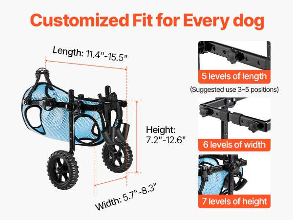 Verstelbaar op meerdere niveaus en comfortabele pasvorm: de hondenrolstoel heeft 5 verstelbare lengtes, 6 breedtes en 7 hoogtes om perfect aan te sluiten op het lichaam van uw hond. De uitgebalanceerde ondersteuning voorkomt knelling van de poten en huidirritatie, wat zorgt voor een comfortabelere, persoonlijke pasvorm.