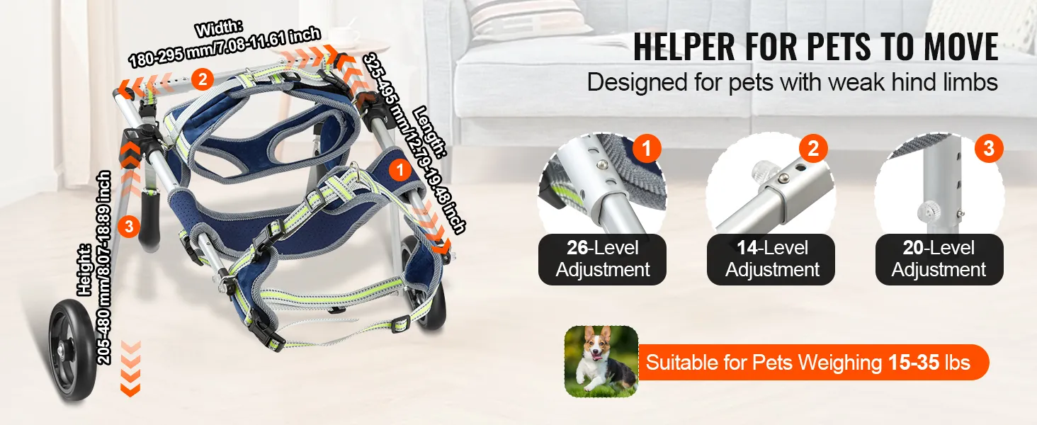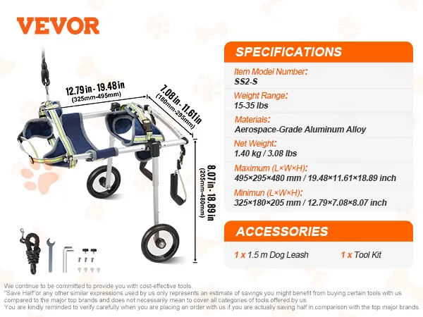 De VEVOR huisdierrolstoel is gemaakt van een aluminiumlegering van ruimtevaartkwaliteit. Dit materiaal is sterk en lichtgewicht. Het is behandeld om corrosie en krassen te weerstaan. Daarom is het duurzaam en strak. Het aluminium frame biedt een robuuste structuur. U kunt huisdieren tot 35 lbs ondersteunen. Het lichtgewicht ontwerp maakt het gemakkelijk te hanteren. Ook hoeft u zich geen zorgen te maken over belasting van uw huisdier. Deze rolstoel is een ander betrouwbaar hulpmiddel voor mobiliteit voor uw huisdier.