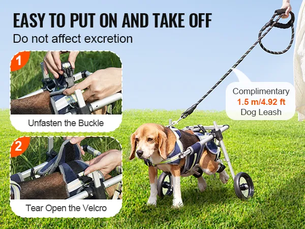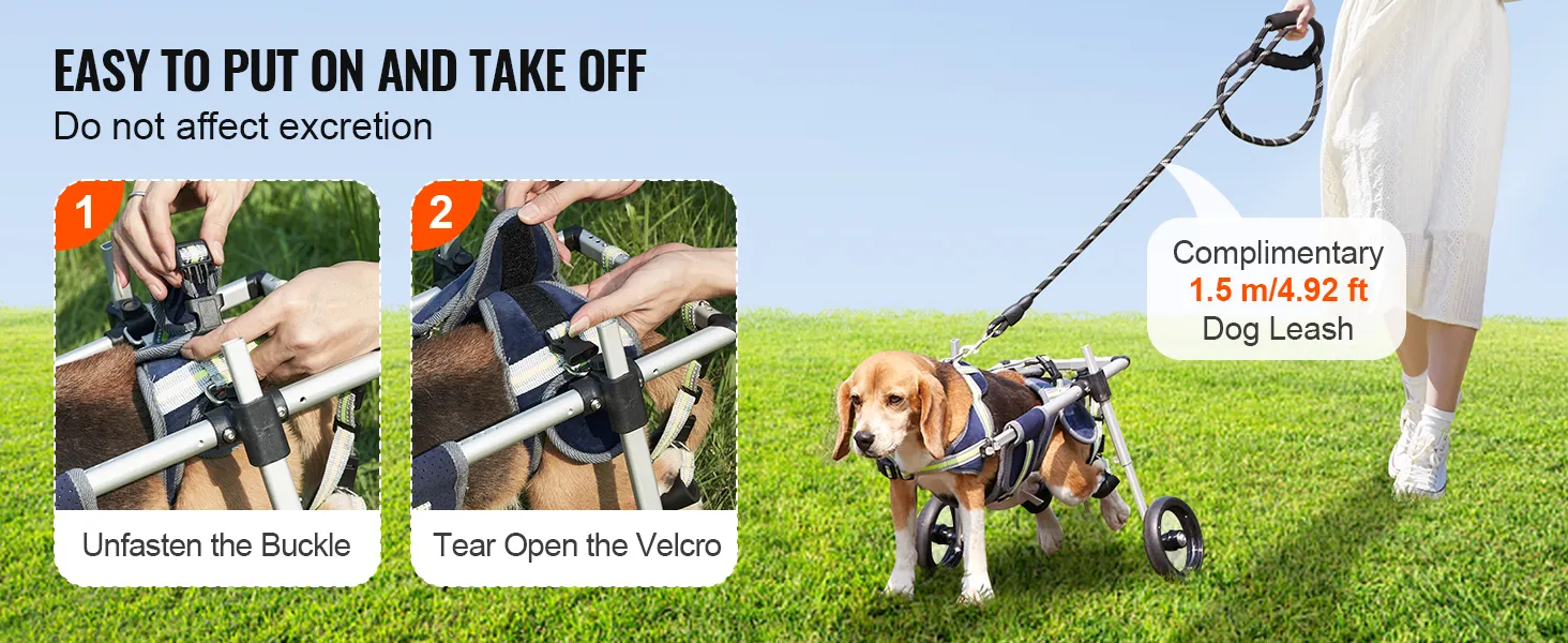 Open een gesp, scheur een deel van het klittenband af - met slechts twee eenvoudige stappen kan uw geliefde huisdier gemakkelijk in of uit zijn kleine rolstoel stappen. We hebben er ook een hondenriem van 1,5 m lang bijgeleverd.