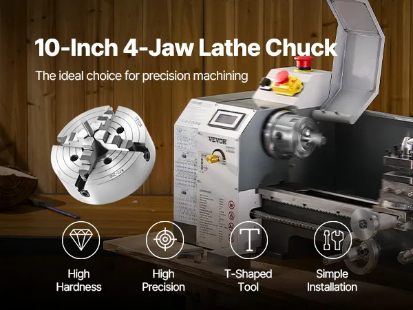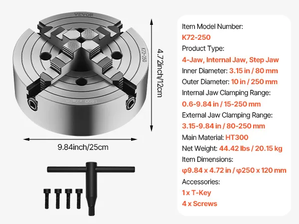 10-inch (250 mm) 4-klauwplaat: Met een binnendiameter van 3,15 inch (80 mm) en een buitendiameter van 10 inch (250 mm) klemt deze zelfcentrerende klauwplaat werkstukken van 0,6 tot 9,84 inch (15 tot 250 mm) vast, waardoor deze ideaal is voor een breed scala aan werkstukgroottes.