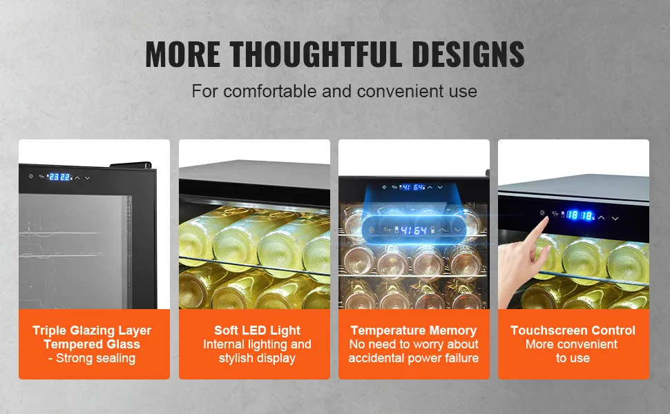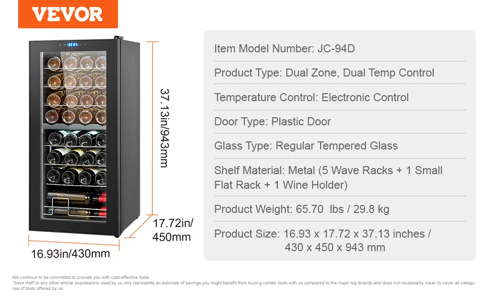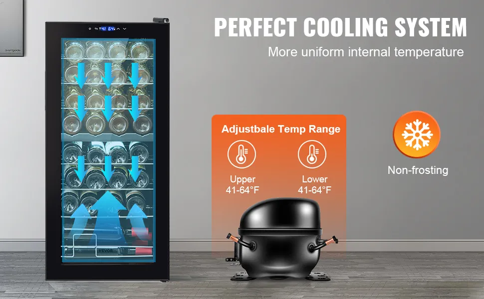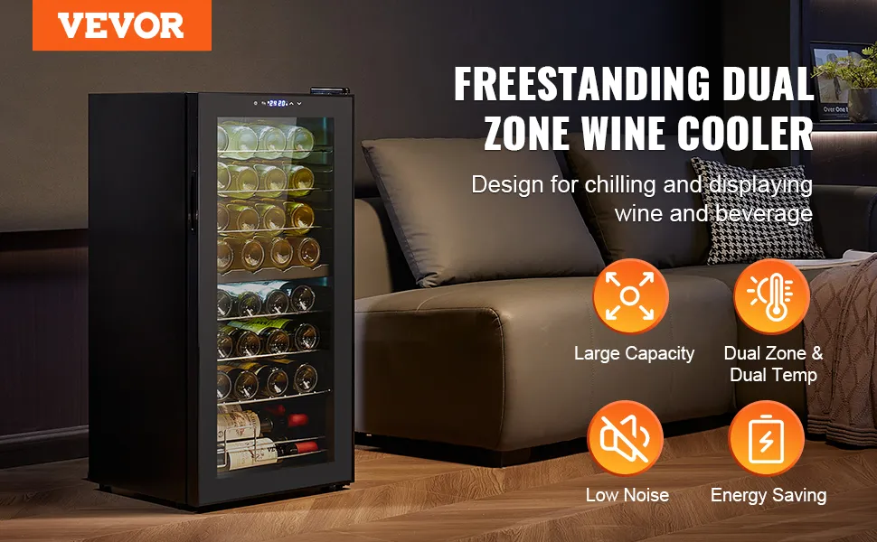 Capaciteit voor 32 flessen: De vrijstaande wijnkoeler van VEVOR biedt plaats aan maximaal 32 flessen wijn van 750 ml. Of je nu een wijnliefhebber of een verzamelaar bent, deze wijnkoeler biedt voldoende ruimte om je favoriete wijnen te presenteren en te laten rijpen.