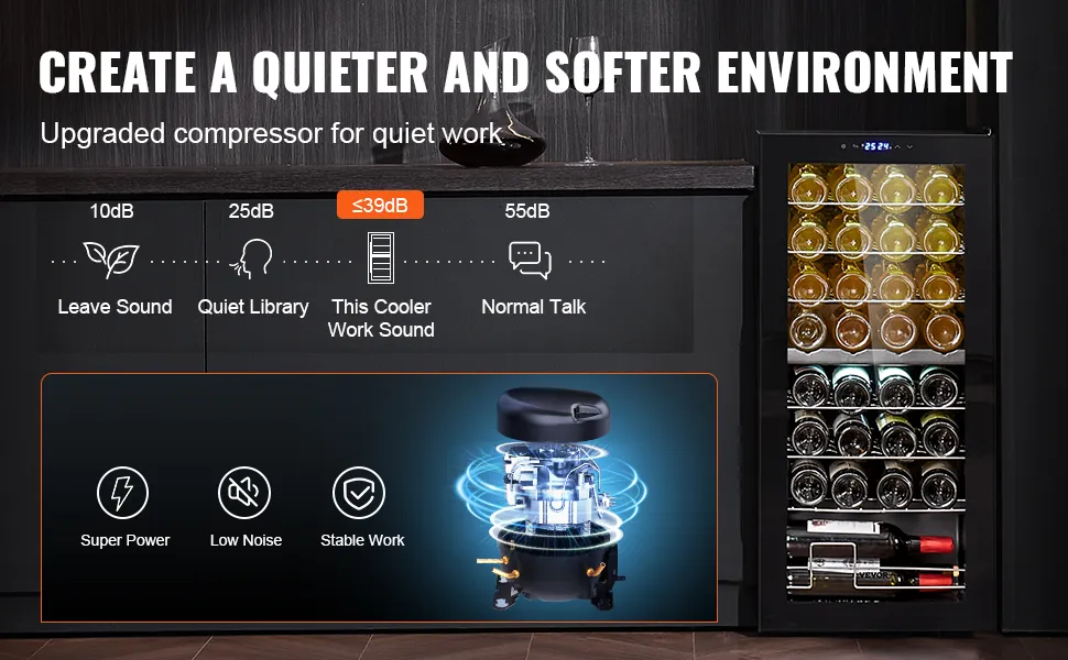 Stille werking: Een moderne compressor zorgt voor snelle, krachtige en stabiele koeling met nauwkeurige luchtvochtigheidsregeling om uw drankjes in perfecte staat te houden. De trillingsarme werking houdt het geluidsniveau onder de 39 decibel, wat zorgt voor een stille omgeving.