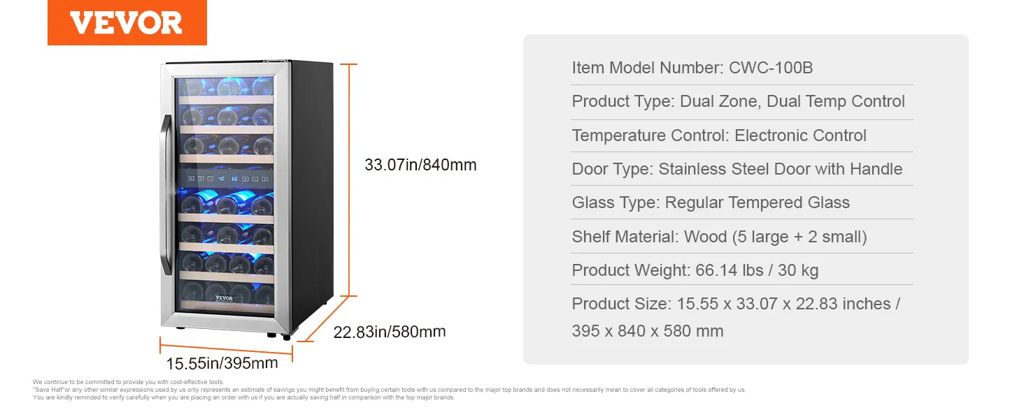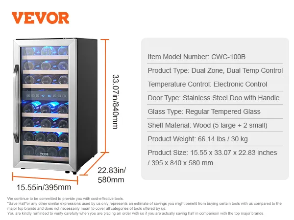 33-Bottle Capacity: The VEVOR freestanding wine cooler holds up to 33 bottles of 750ml wine. Whether you’re a wine enthusiast or collector, this cooler provides ample space to showcase and age your favorite wines.
