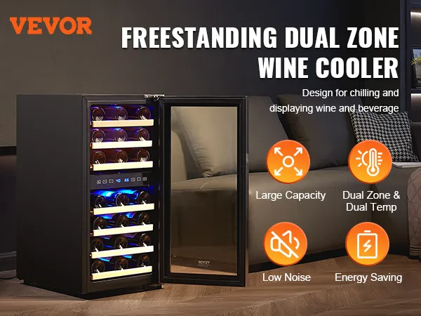 This freestanding wine cooler features dual-zone temperature control and circulating air cooling system. Its large capacity and low-noise design ensure a comfortable experience, meticulously caring for each bottle of your fine wine, while also chill other beverages that need refrigeration.