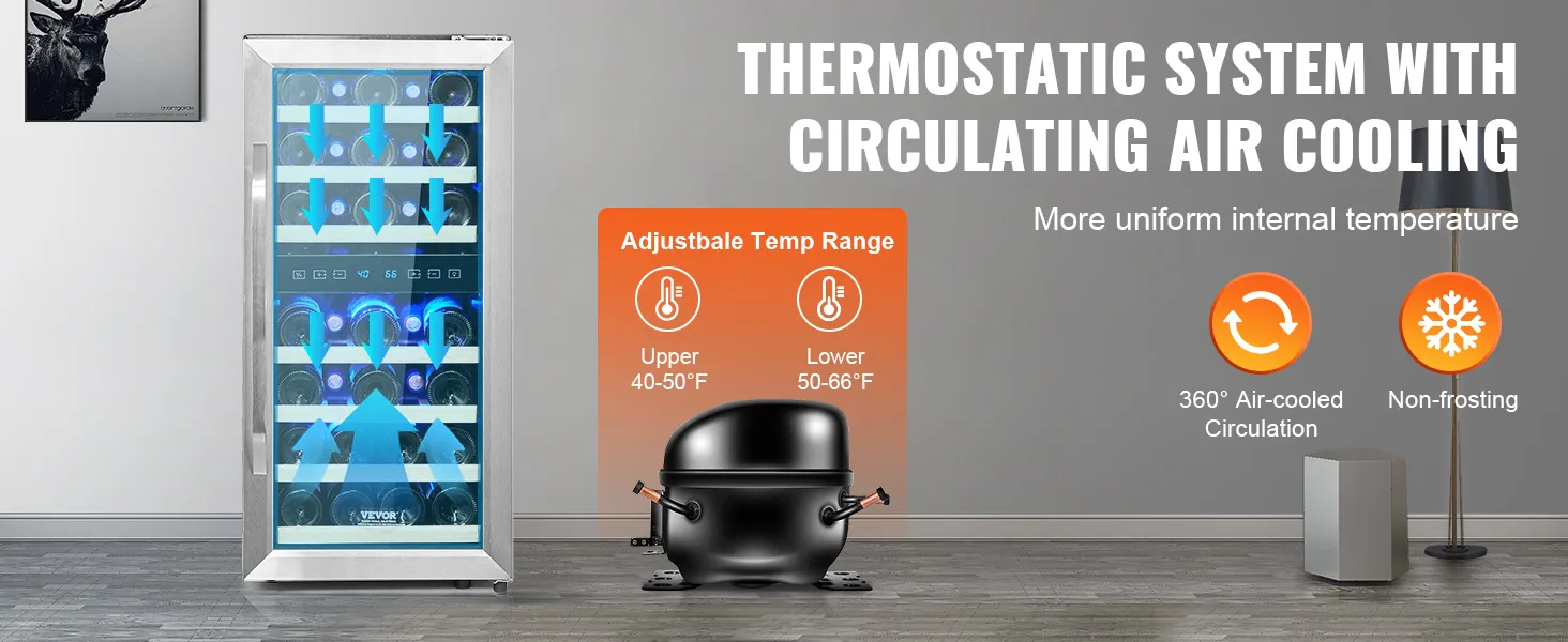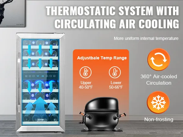 Dual-Zone Temperature Control: Dual-zone cooling with independent temperature controls. The upper zone ranges from 40°F to 50°F, and the lower zone also ranges from 50°F to 66°F, allowing you to adjust settings according to your needs for optimal wine storage.