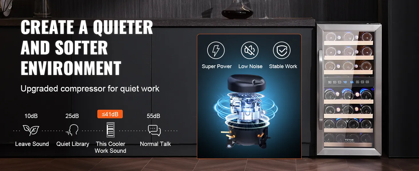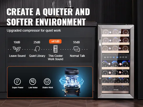 Silent Operation: Featuring an advanced compressor that delivers rapid, powerful, and stable cooling with precise humidity control, ensuring your beverages remain in perfect condition. Low-vibration operation keeps noise levels below 41 decibels, creating a quiet environment.