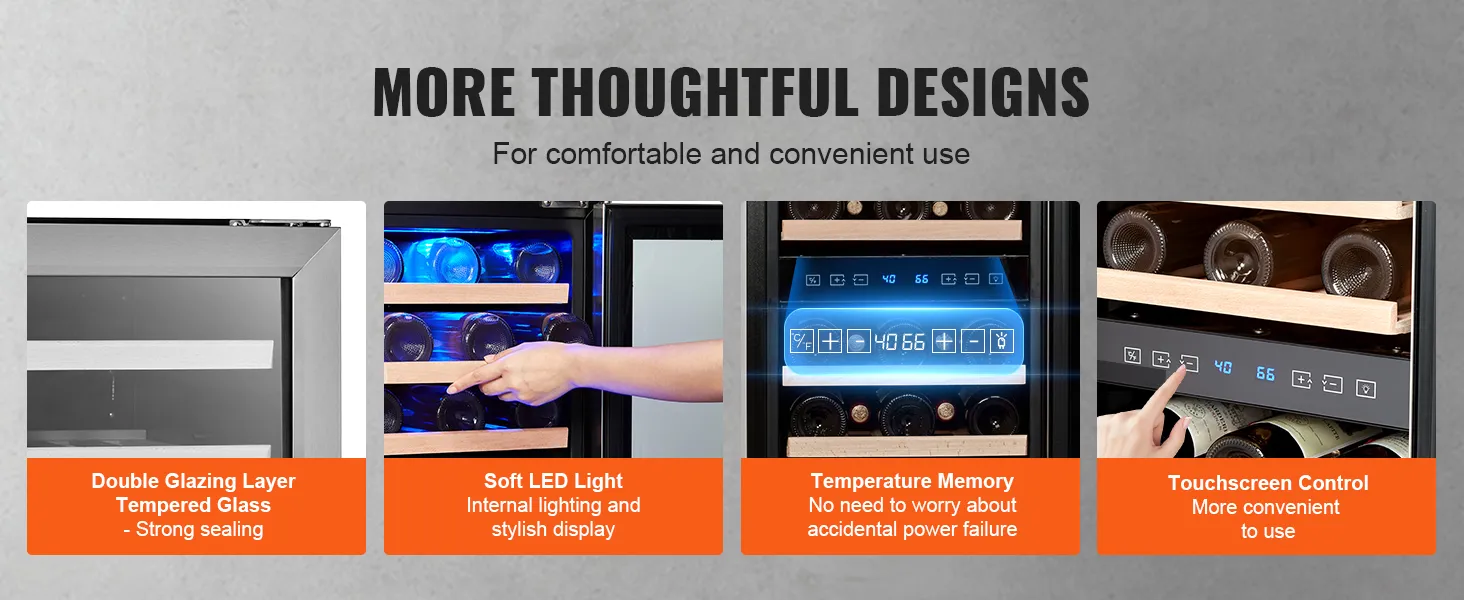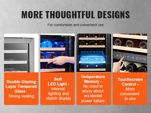 Thoughtful Details: The double-layered tempered glass door not only insulates the interior but also protects your collection from harmful UV rays. Adjustable wood shelves are easily removable; soft LED lighting illuminates the interior for easy access to your collection. Temperature memory function resumes the original settings after a power outage. Touchscreen controls make operation convenient, and the front ventilation ensures effective heat dissipation.
