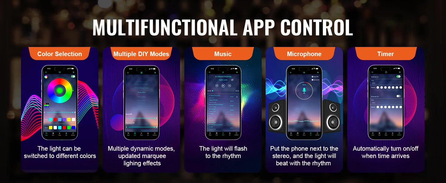 Gratis bediening binnen 8 meter: Ben je de verwarrende instellingen en aanpassingen beu? Met onze barverlichting heb jij de controle! Ondersteund door RF-afstandsbediening en intelligente app-bediening, kunt u effecten naar wens aanpassen, waaronder 7 statische kleuren, 22 dynamische kleuren, meerdere doe-het-zelf-modi, muziekmodi en timing van 1-4 uur. Bovendien kunnen meerdere bars tegelijkertijd worden bediend met één afstandsbediening.