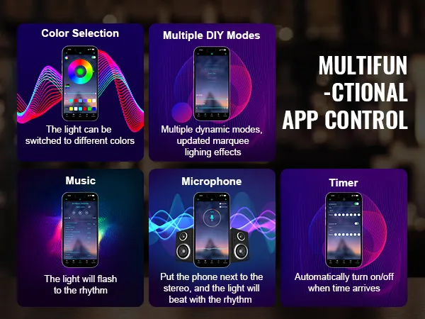 Gratis bediening binnen 8 meter: Ben je de verwarrende instellingen en aanpassingen beu? Met onze barverlichting heb jij de controle! Ondersteund door RF-afstandsbediening en intelligente app-bediening, kunt u effecten naar wens aanpassen, waaronder 7 statische kleuren, 22 dynamische kleuren, meerdere doe-het-zelf-modi, muziekmodi en timing van 1-4 uur. Bovendien kunnen meerdere bars tegelijkertijd worden bediend met één enkele afstandsbediening.