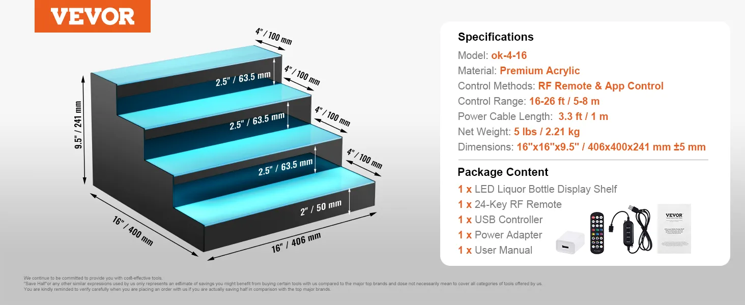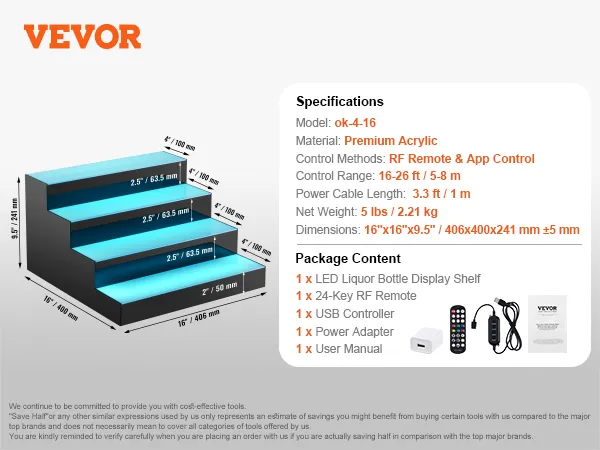 VEVOR Bar Shelf Wijnrek, LED-verlichte barplank voor thuis met RF-afstandsbediening en app-bediening, 4-laags acryl drankverlichtingsplank, 406 x 400 x 241 mm wijnflessenstandaard vrijstaand